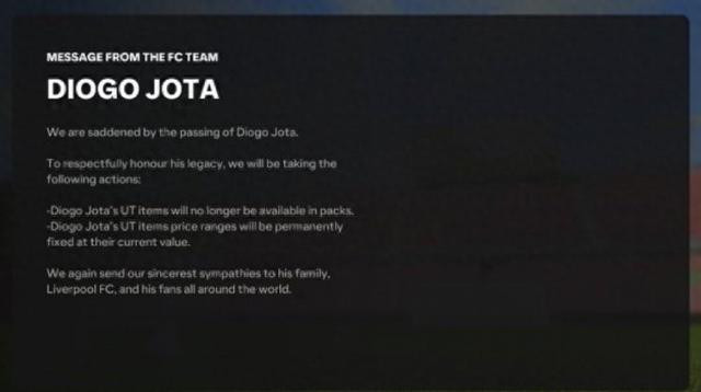 FC25悼念若塔: 出于尊重, 若塔UT卡将不再出现在卡包中&数值锁定